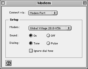 Are you set to the right modem and port? iMacs have an internal modem so the above settings would be wrong. It is very rare that a user would connect their modem to the Printer port. If it is a non-iMac (any PowerMac with Mac OS 8.5 installed) with an external modem, the setting will always be the Modem Port.