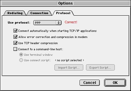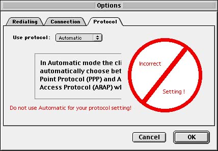 The most common problem with PPP and TCP/IP on the iMac and Mac OS 8.5 are the Remote Access Control Panel settings. The Remote Access Control Panel was called PPP in previous versions of the Mac OS. (8.1 and earlier) The term PPP is now found only in the settings of the Remote Access Control Panel and the TCP/IP Control Panel. Since Remote Access can utilize the dial-up feature on the Mac in various ways, it is easy for them to be set improperly when dialing into the Internet.